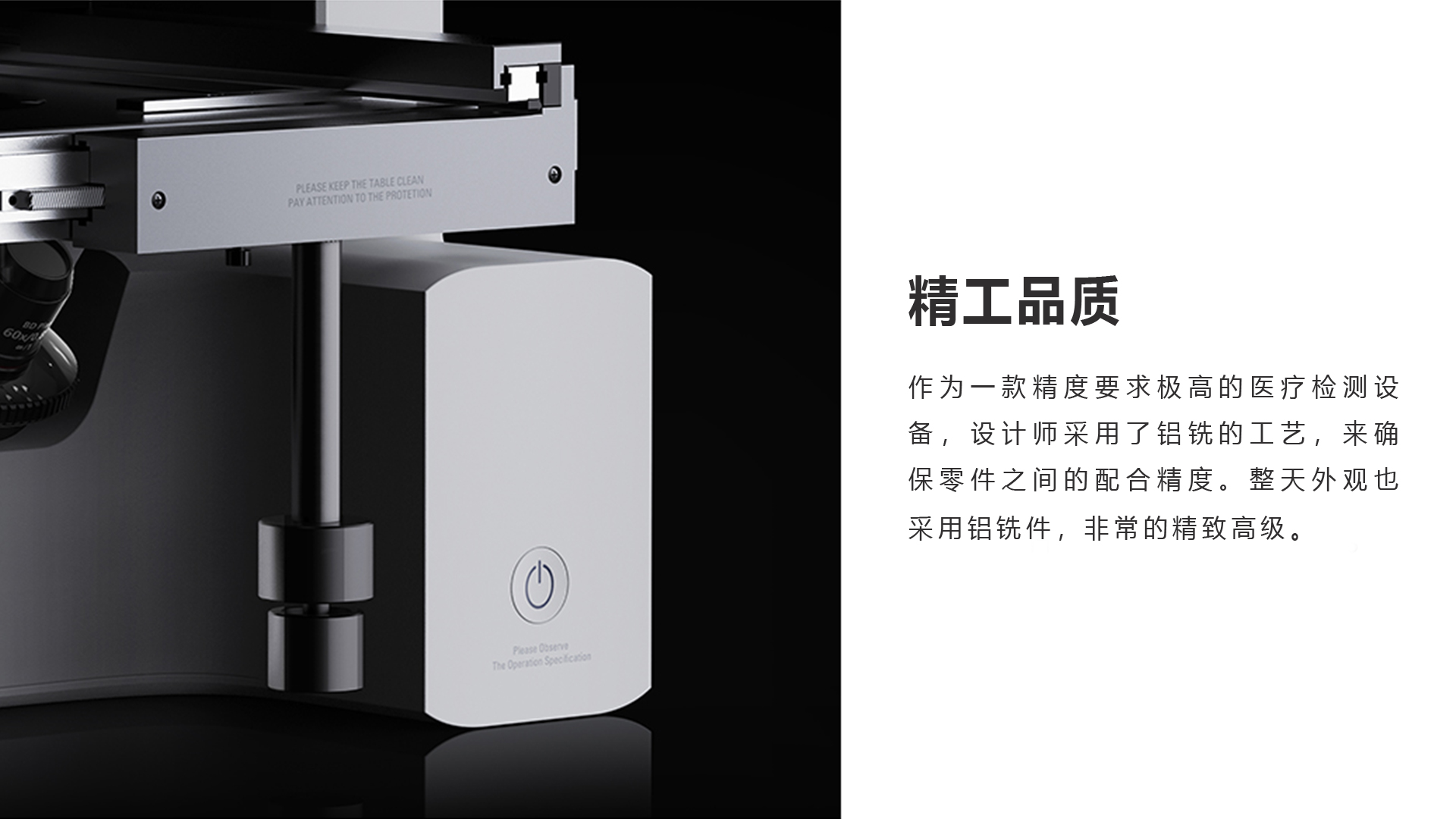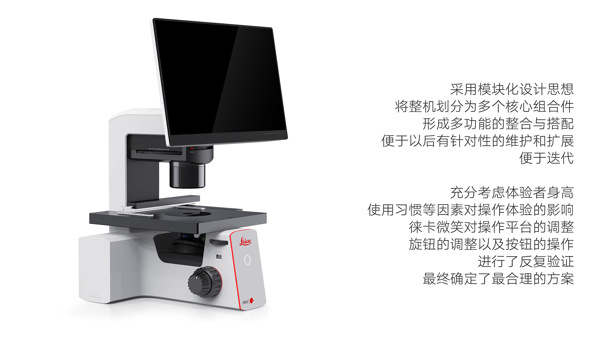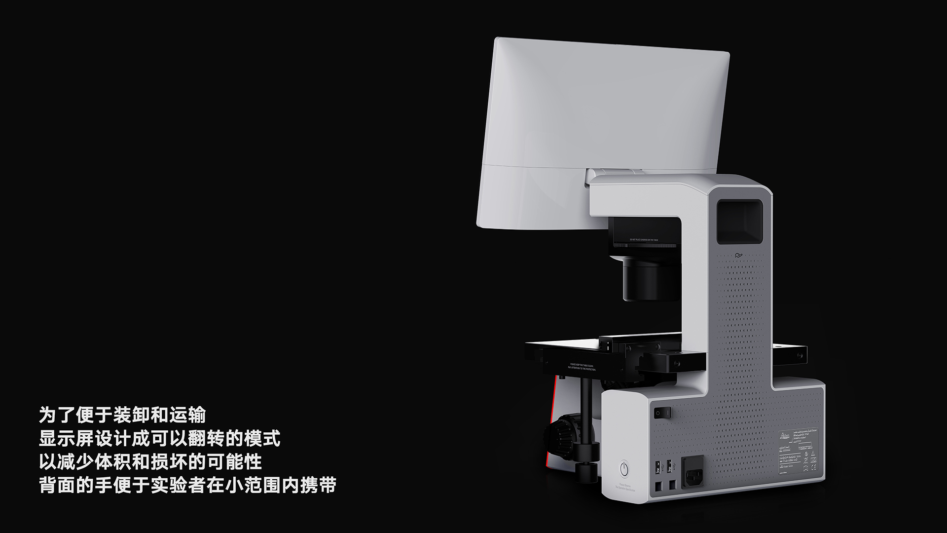 該顯微鏡采用模塊化設(shè)計(jì)思路,將整機(jī)分類成多個(gè)核心組合部件,形成多功能的整合與搭配。方便后期進(jìn)行針對(duì)性維修和拓展,便于迭代。充分考慮實(shí)驗(yàn)者身高,使用習(xí)慣等因素對(duì)操作體驗(yàn)的影響,徠卡SMILE對(duì)操作臺(tái)的調(diào)節(jié),旋鈕的調(diào)節(jié),按鈕的操作等進(jìn)行反復(fù)的驗(yàn)證,最終確認(rèn)最合理的方案。產(chǎn)品為方便搬運(yùn)和運(yùn)輸,將顯示屏設(shè)計(jì)成可翻折的模式,減小體積,減小損傷的可能性。背后的摳手方便實(shí)驗(yàn)人員在小范圍內(nèi)搬運(yùn)。
